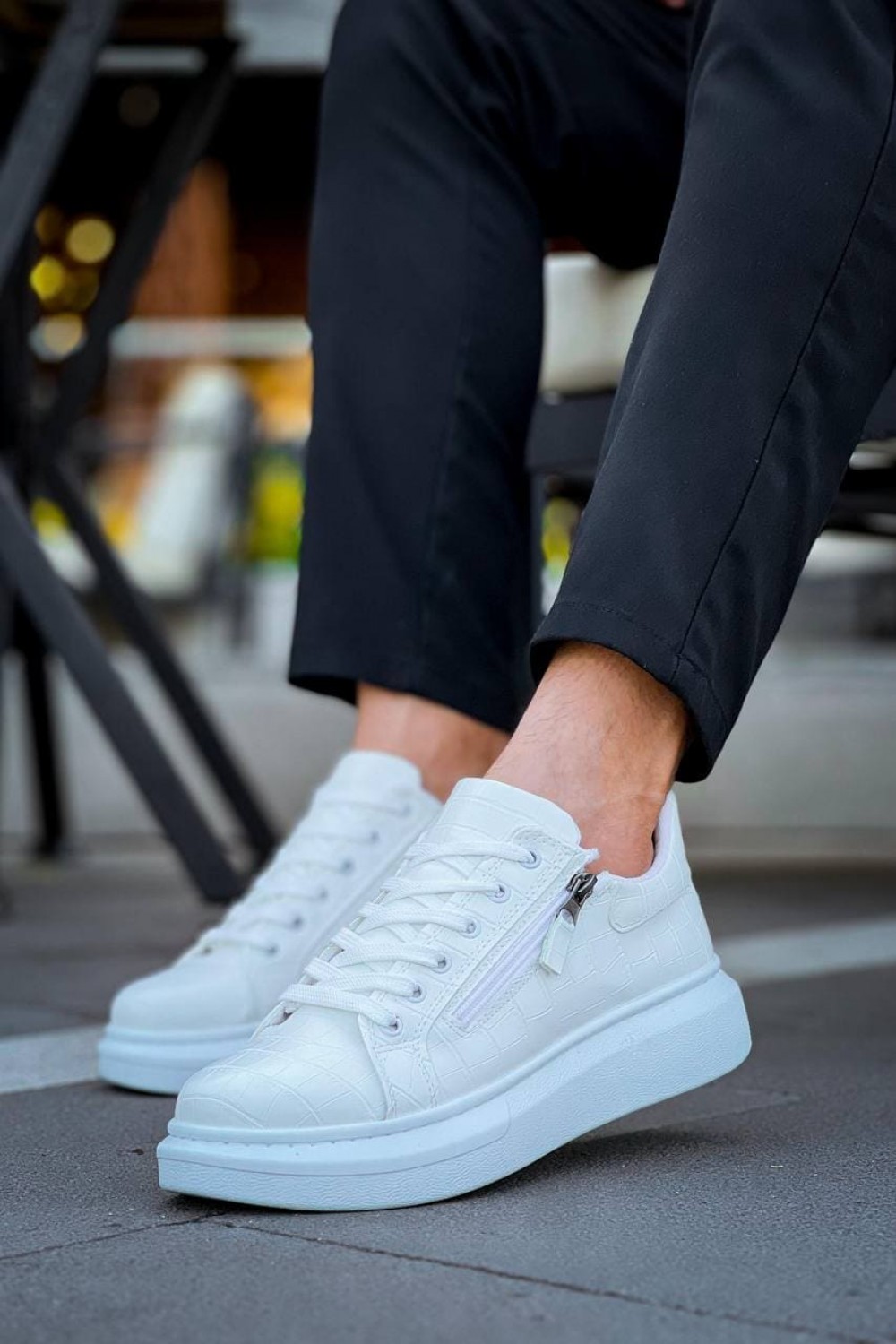 KB309 Erkek Günlük Bağcıklı Fermuarlı Croco Desenli Cilt Spor Sneaker Ayakkabı CBT - Beyaz